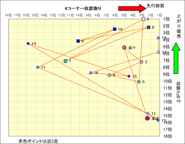 近走における4コーナーでの位置取りと上がり順位(頭数補正後) |