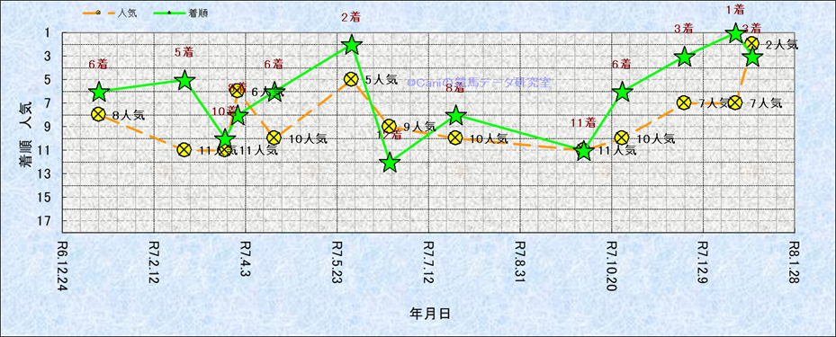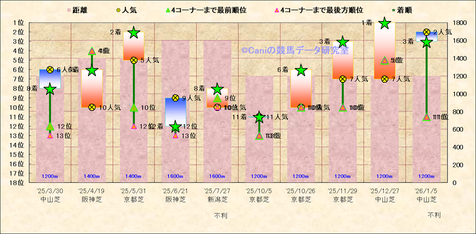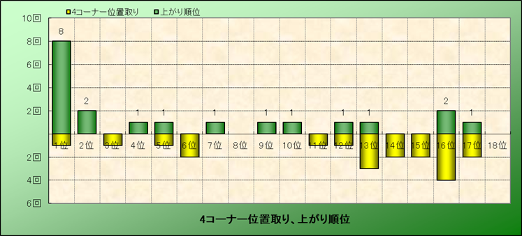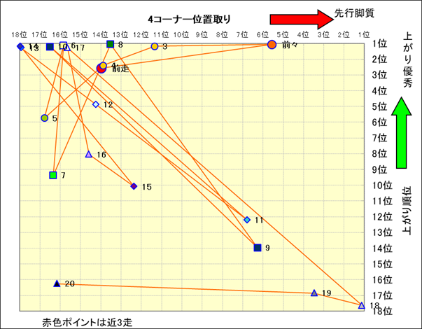 脚質解析 近20レースの4コーナーでの位置取りと上がり順位(頭数補正後) |