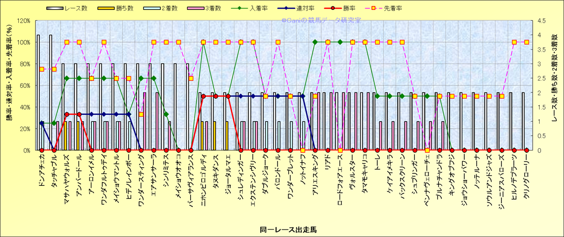 ライバル(相性)解析 同一レースに下記馬が出走した場合の成績とその馬に先着する先着率 |