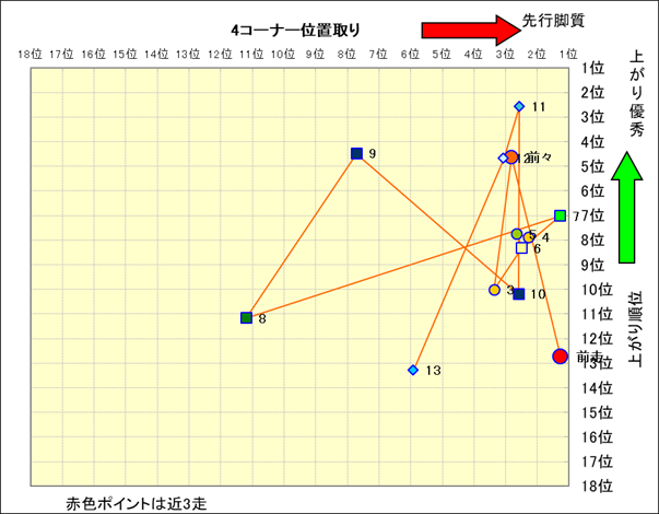 近走における4コーナーでの位置取りと上がり順位(頭数補正後) |