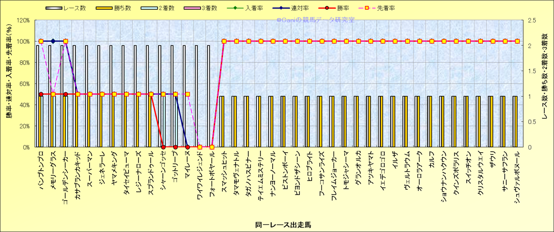ライバル(相性)解析 同一レースに下記馬が出走した場合の成績とその馬に先着する先着率 |