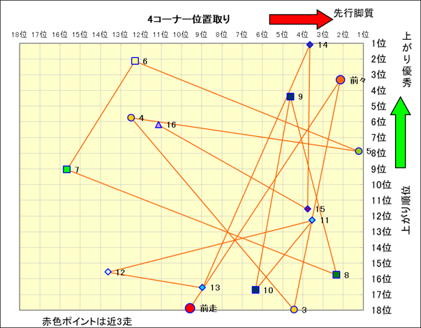 近走における4コーナーでの位置取りと上がり順位(頭数補正後) |