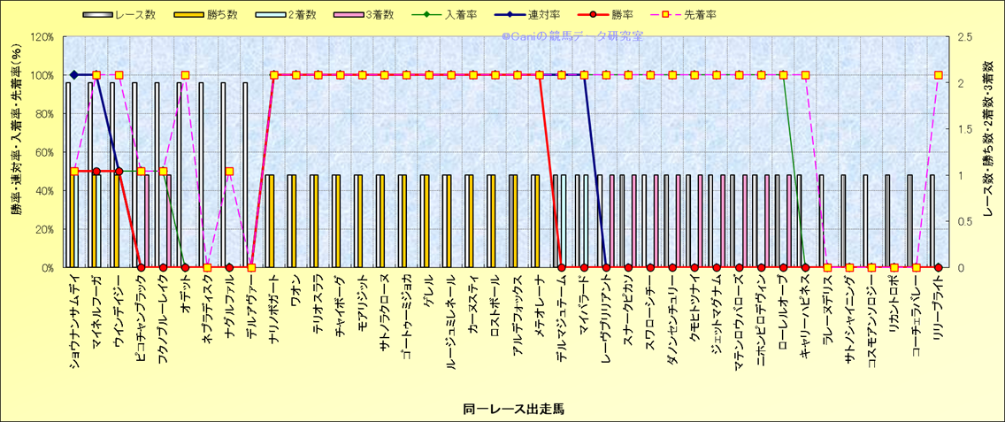 ライバル(相性)解析 同一レースに下記馬が出走した場合の成績とその馬に先着する先着率 |