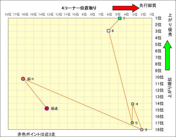 近走における4コーナーでの位置取りと上がり順位(頭数補正後) |