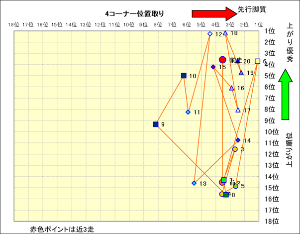 脚質解析 近20レースの4コーナーでの位置取りと上がり順位(頭数補正後) |