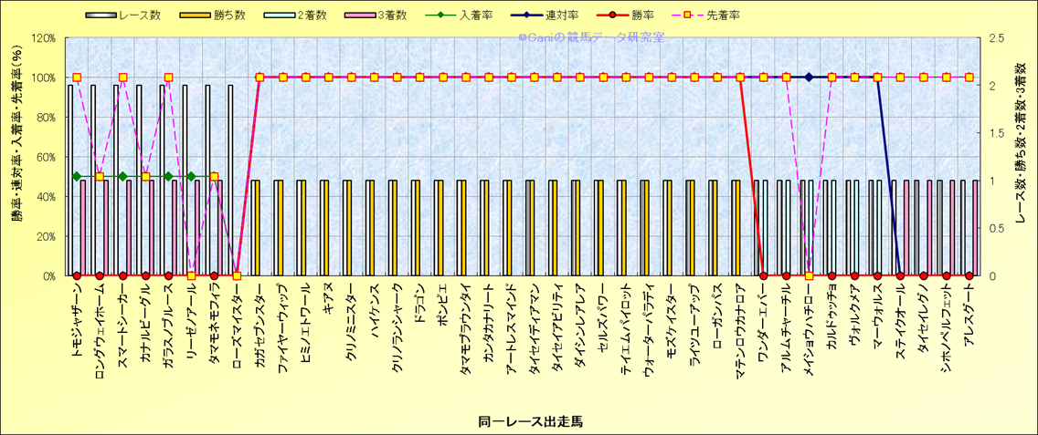ライバル(相性)解析 同一レースに下記馬が出走した場合の成績とその馬に先着する先着率 |
