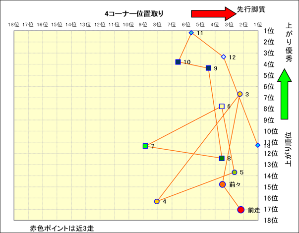 近走における4コーナーでの位置取りと上がり順位(頭数補正後) |