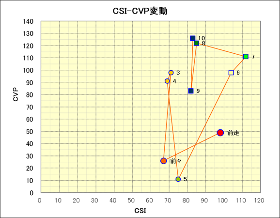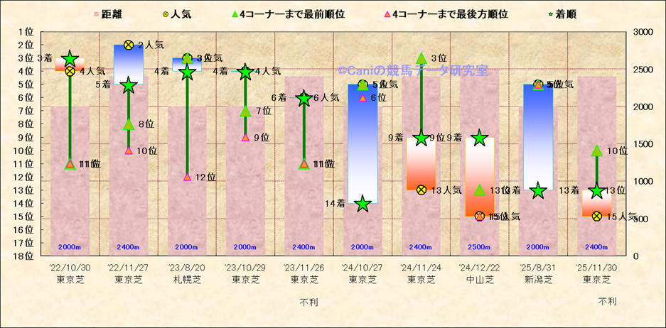 近走における4コーナーでの位置取りと上がり順位(頭数補正後) |