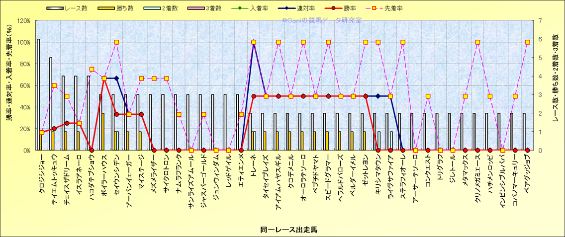 ライバル(相性)解析 同一レースに下記馬が出走した場合の成績とその馬に先着する先着率 |