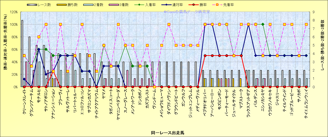 ライバル(相性)解析 同一レースに下記馬が出走した場合の成績とその馬に先着する先着率 |
