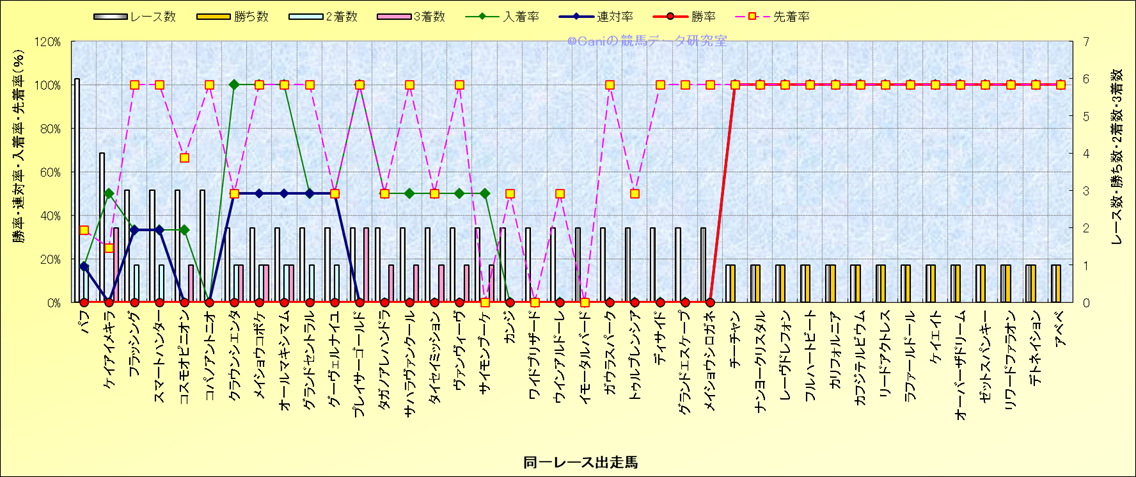 ライバル(相性)解析 同一レースに下記馬が出走した場合の成績とその馬に先着する先着率 |