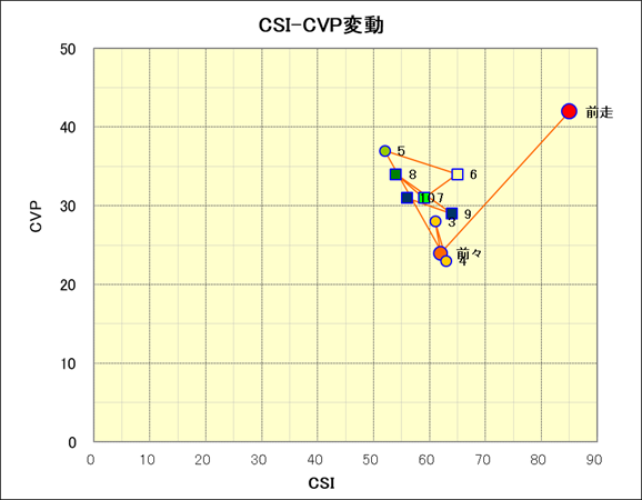 近走における4コーナーでの位置取りと上がり順位(頭数補正後) |