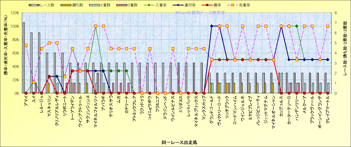ライバル(相性)解析 同一レースに下記馬が出走した場合の成績とその馬に先着する先着率 |