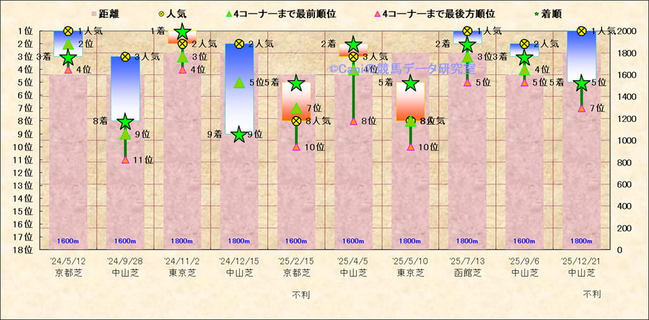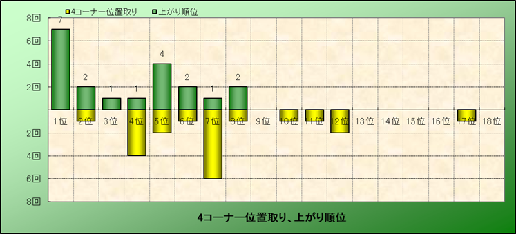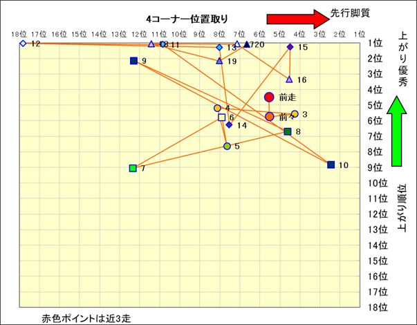 脚質解析 近20レースの4コーナーでの位置取りと上がり順位(頭数補正後) |