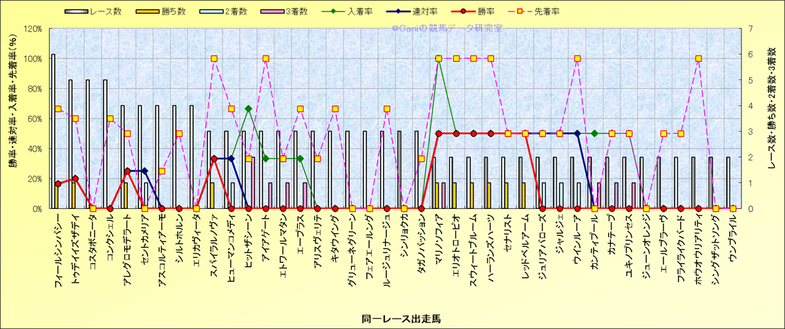 ライバル(相性)解析 同一レースに下記馬が出走した場合の成績とその馬に先着する先着率 |