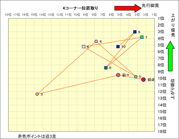 近走における4コーナーでの位置取りと上がり順位(頭数補正後) |