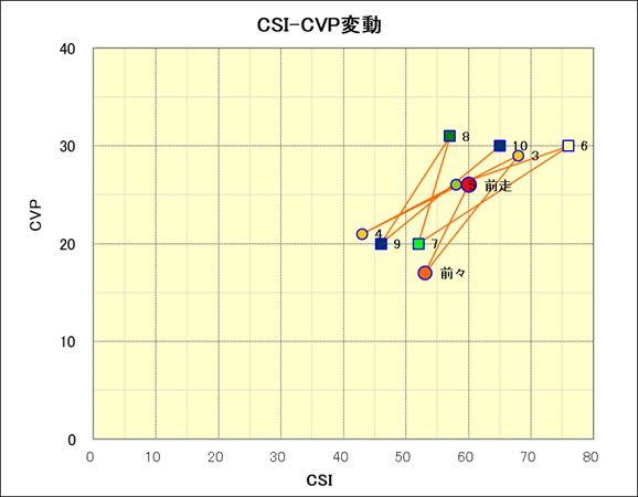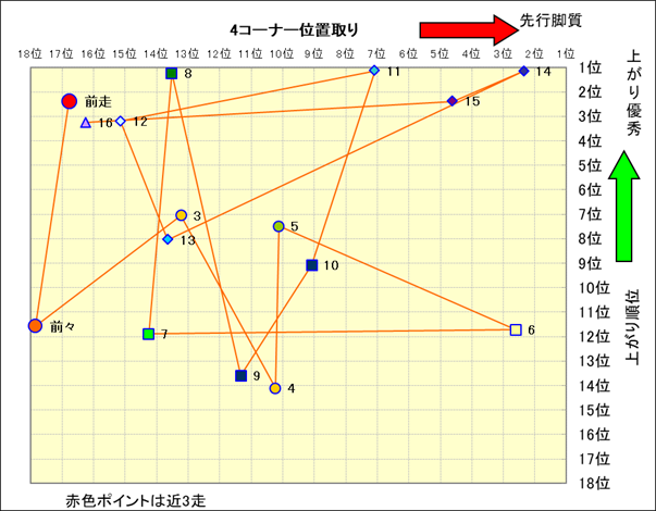 近走における4コーナーでの位置取りと上がり順位(頭数補正後) |