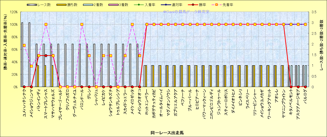ライバル(相性)解析 同一レースに下記馬が出走した場合の成績とその馬に先着する先着率 |