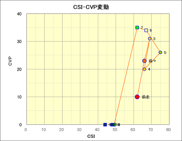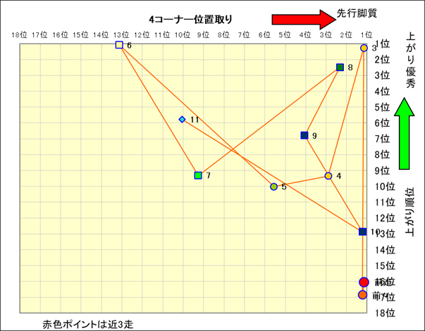 近走における4コーナーでの位置取りと上がり順位(頭数補正後) |