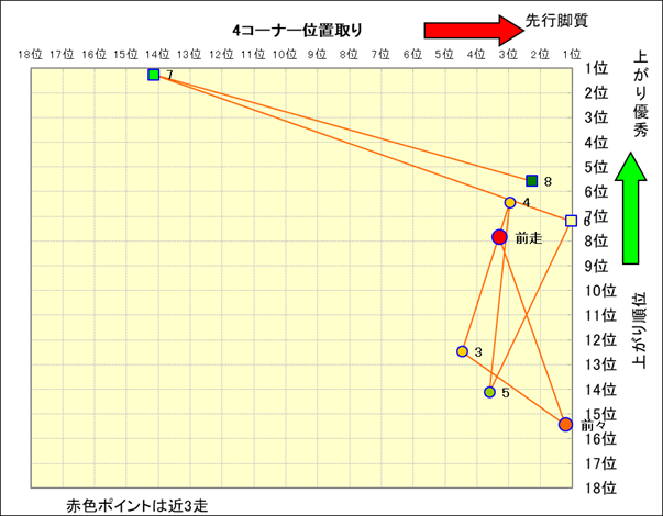 近走における4コーナーでの位置取りと上がり順位(頭数補正後) |