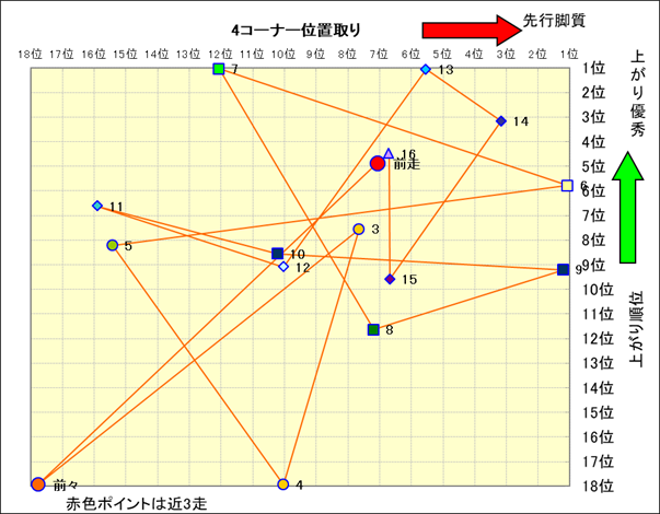 近走における4コーナーでの位置取りと上がり順位(頭数補正後) |