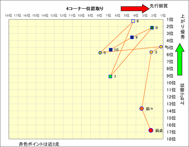 近走における4コーナーでの位置取りと上がり順位(頭数補正後) |