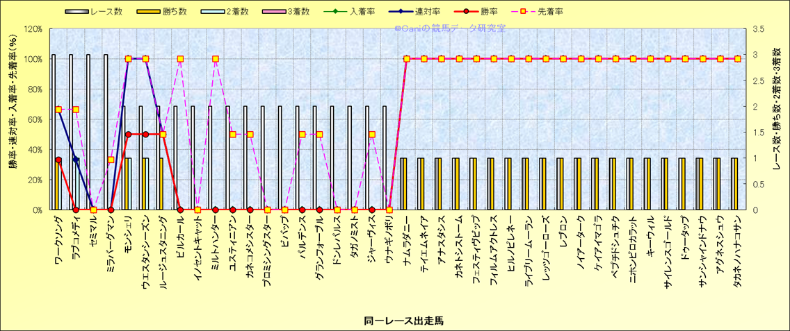 ライバル(相性)解析 同一レースに下記馬が出走した場合の成績とその馬に先着する先着率 |