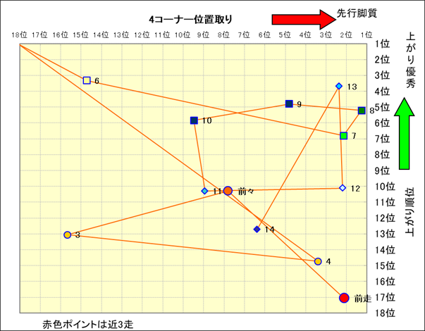 近走における4コーナーでの位置取りと上がり順位(頭数補正後) |