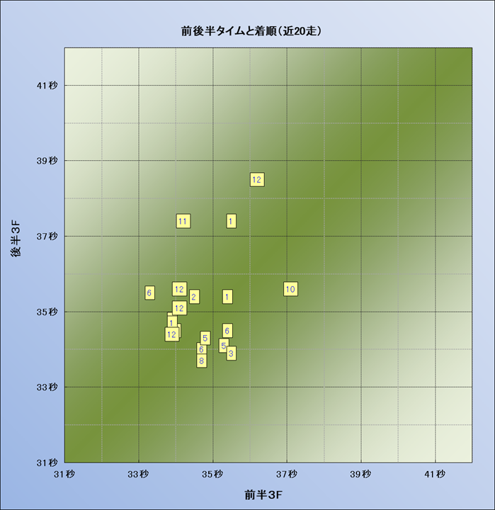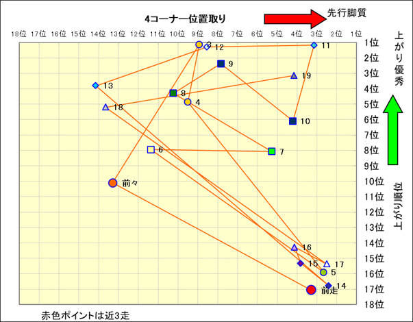 脚質解析 近20レースの4コーナーでの位置取りと上がり順位(頭数補正後) |
