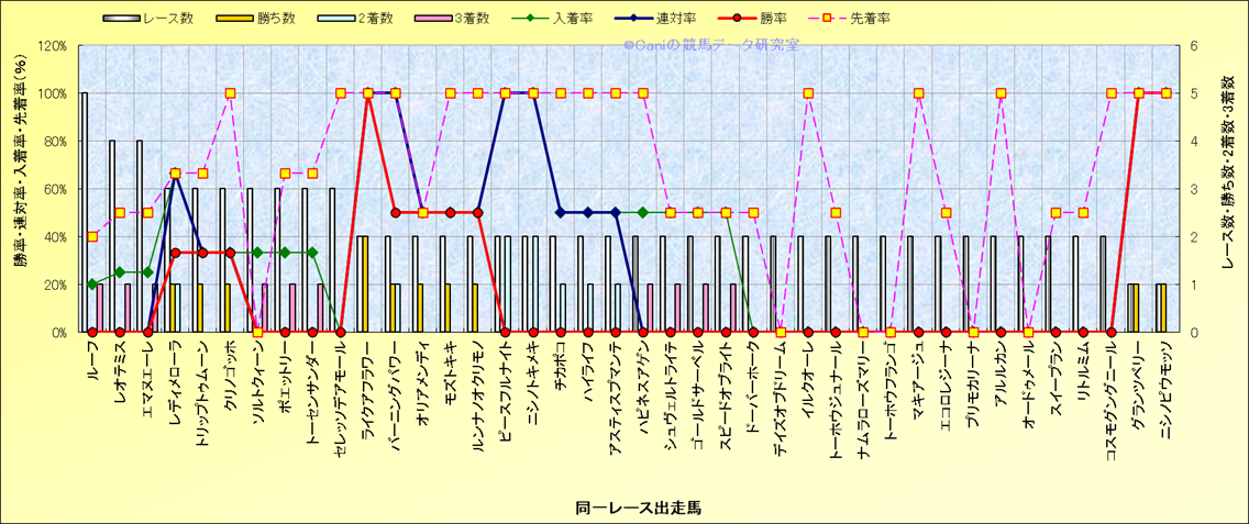 ライバル(相性)解析 同一レースに下記馬が出走した場合の成績とその馬に先着する先着率 |