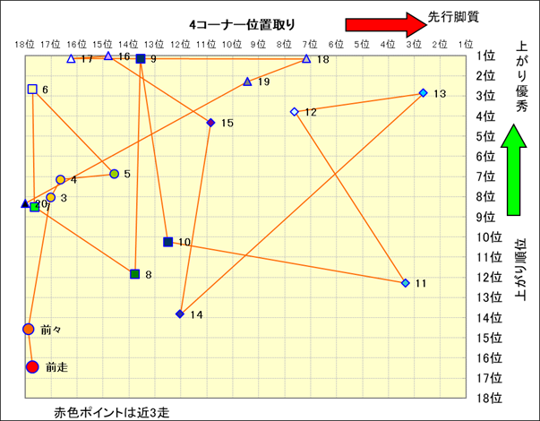 脚質解析 近20レースの4コーナーでの位置取りと上がり順位(頭数補正後) |