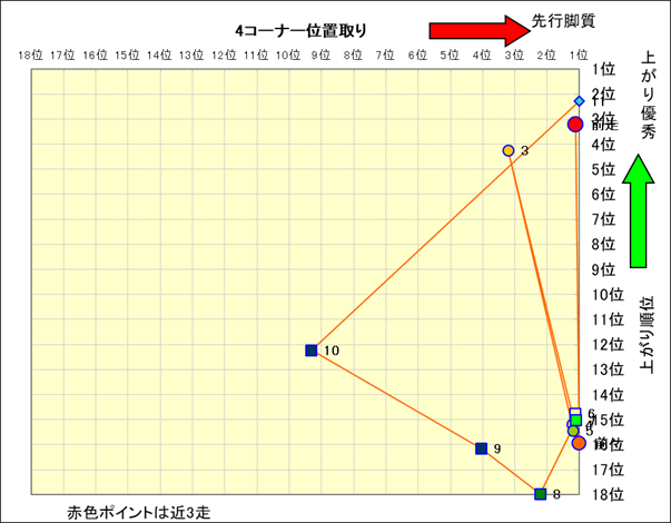 近走における4コーナーでの位置取りと上がり順位(頭数補正後) |