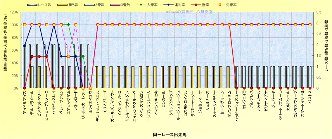 ライバル(相性)解析 同一レースに下記馬が出走した場合の成績とその馬に先着する先着率 |