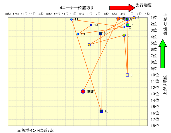 近走における4コーナーでの位置取りと上がり順位(頭数補正後) |