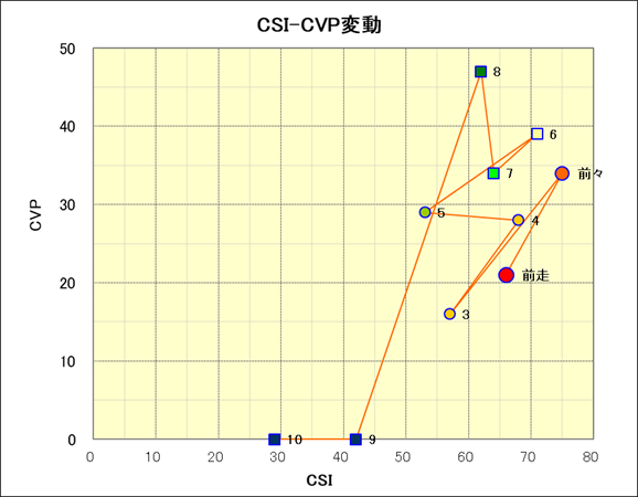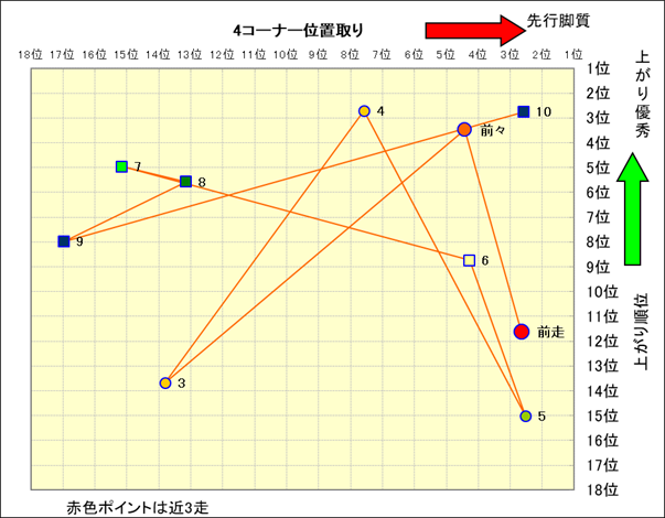 近走における4コーナーでの位置取りと上がり順位(頭数補正後) |