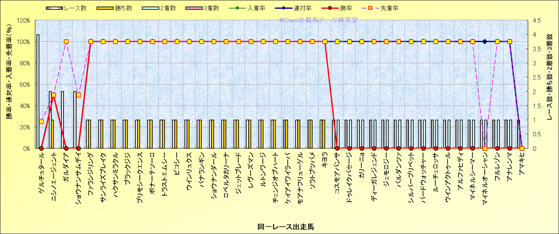 ライバル(相性)解析 同一レースに下記馬が出走した場合の成績とその馬に先着する先着率 |