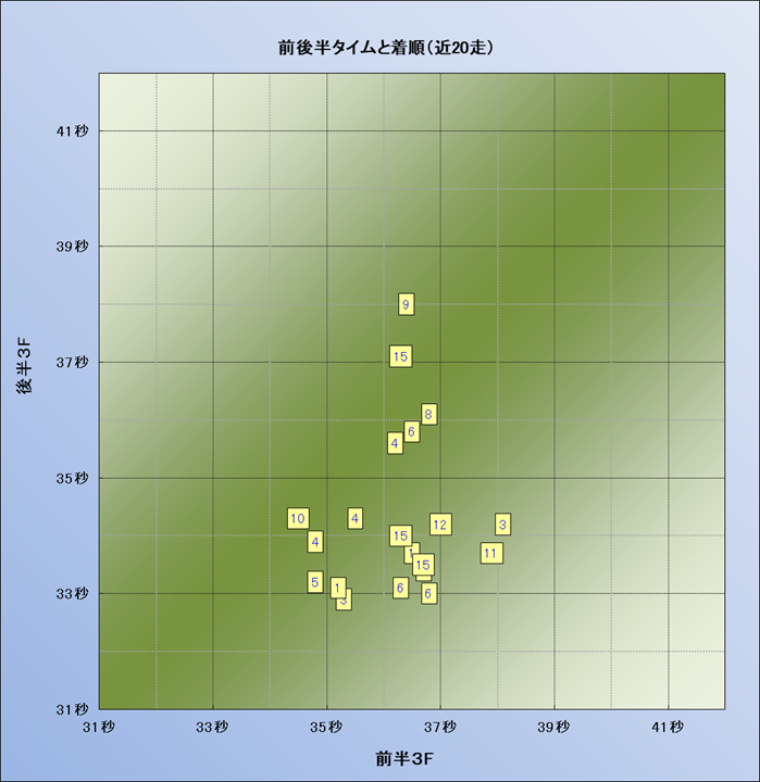 脚質解析 近20レースの4コーナーでの位置取りと上がり順位(頭数補正後) |