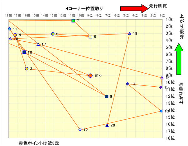 近走における4コーナーでの位置取りと上がり順位(頭数補正後) |