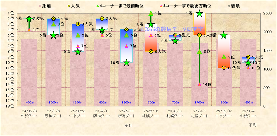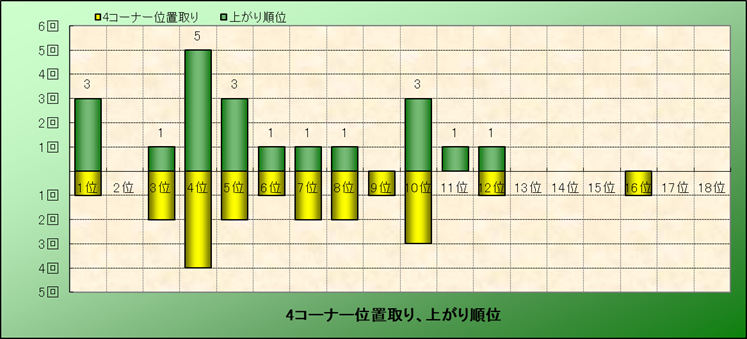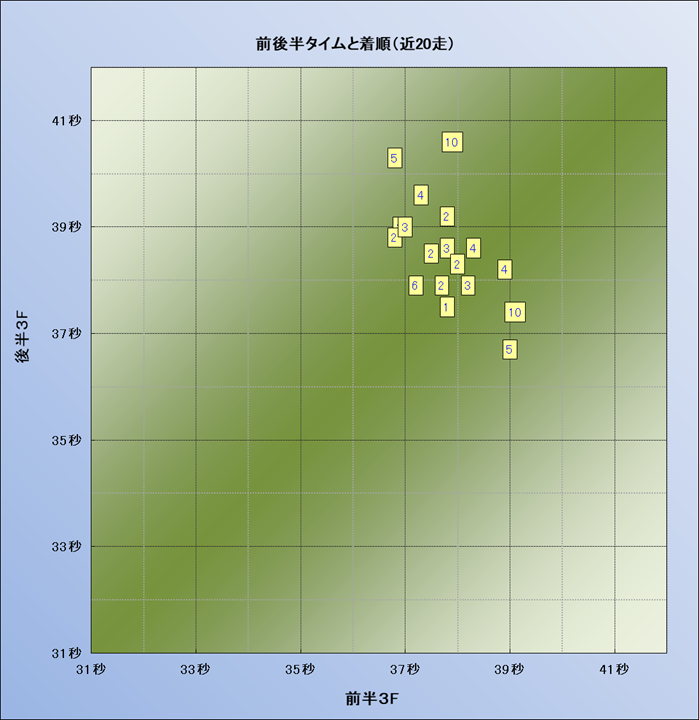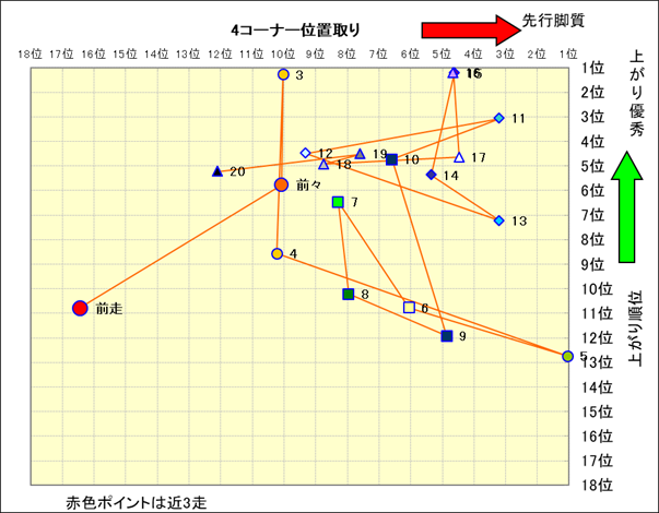 脚質解析 近20レースの4コーナーでの位置取りと上がり順位(頭数補正後) |
