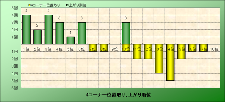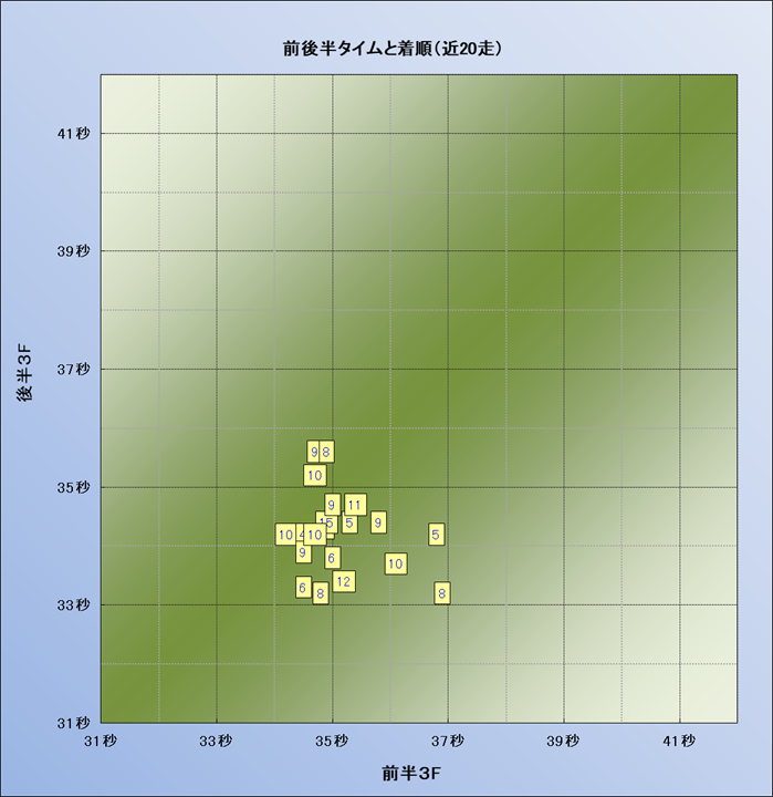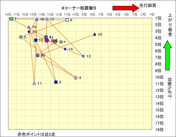 脚質解析 近20レースの4コーナーでの位置取りと上がり順位(頭数補正後) |