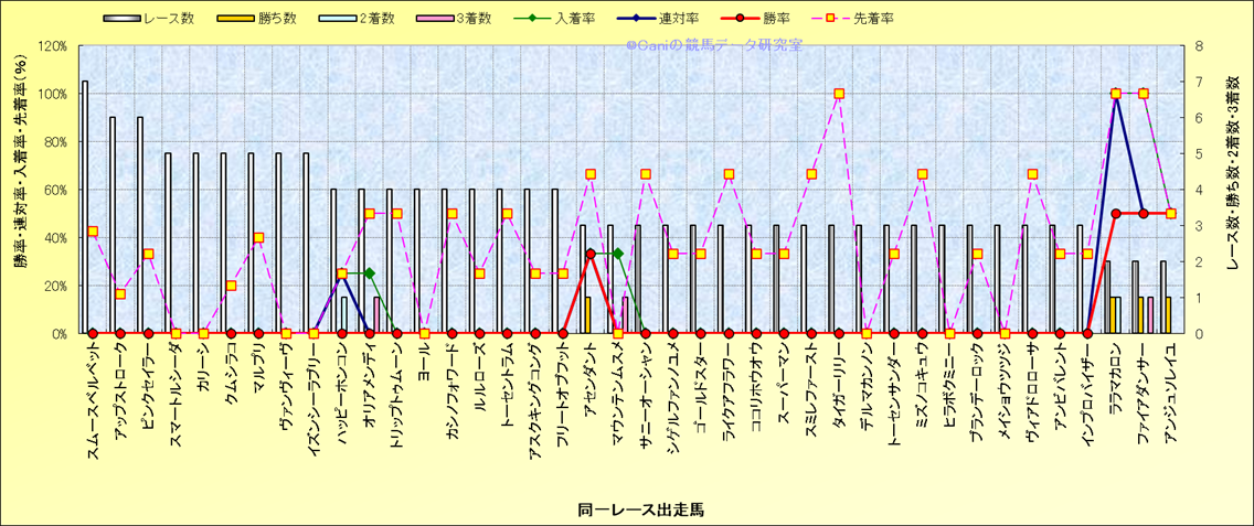 ライバル(相性)解析 同一レースに下記馬が出走した場合の成績とその馬に先着する先着率 |
