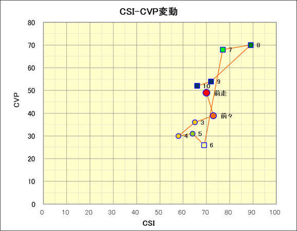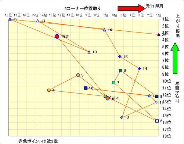 近走における4コーナーでの位置取りと上がり順位(頭数補正後) |