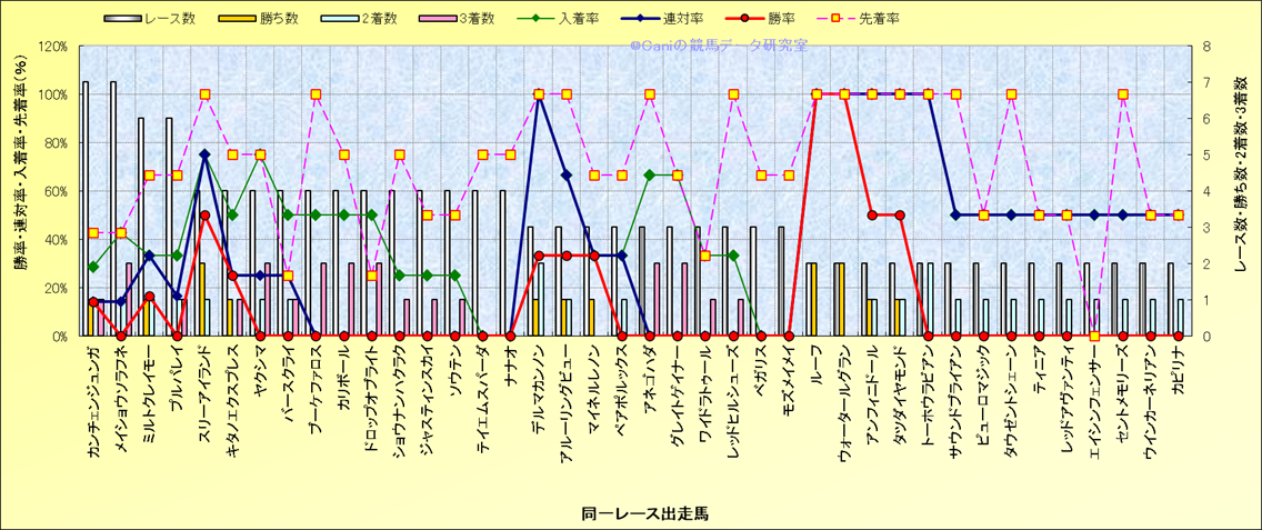 ライバル(相性)解析 同一レースに下記馬が出走した場合の成績とその馬に先着する先着率 |