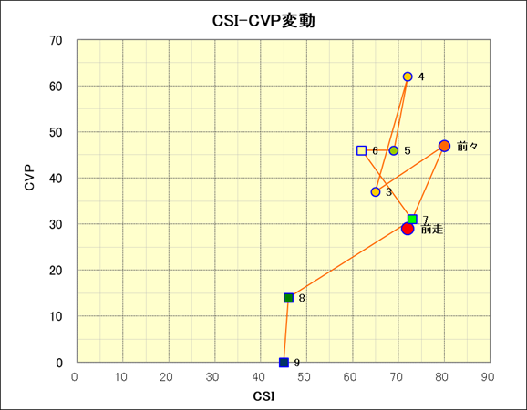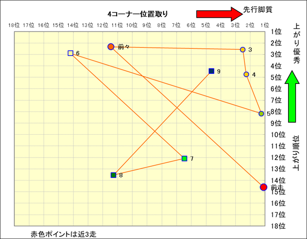 近走における4コーナーでの位置取りと上がり順位(頭数補正後) |