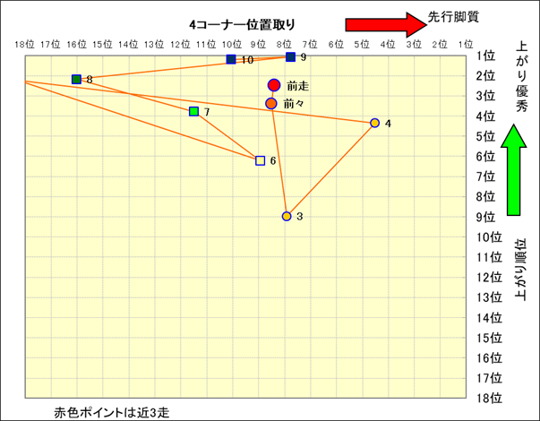 近走における4コーナーでの位置取りと上がり順位(頭数補正後) |