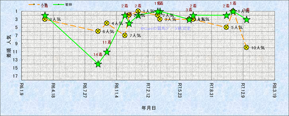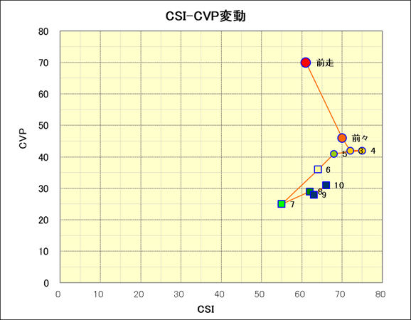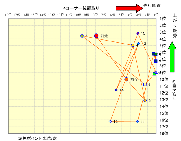 近走における4コーナーでの位置取りと上がり順位(頭数補正後) |