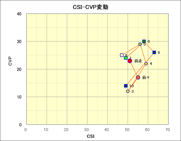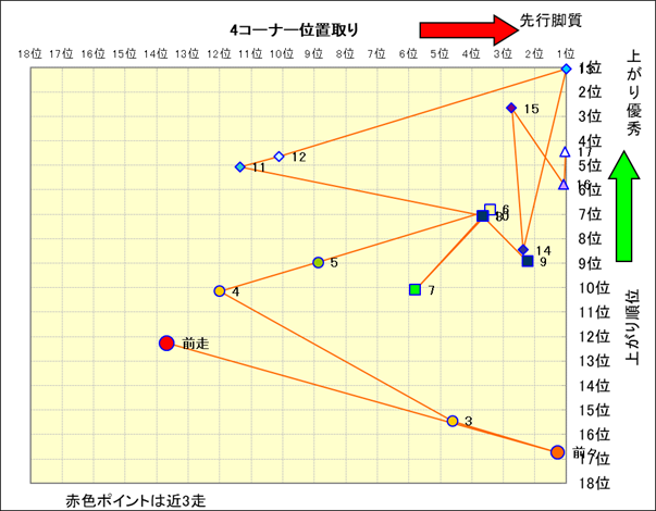 近走における4コーナーでの位置取りと上がり順位(頭数補正後) |