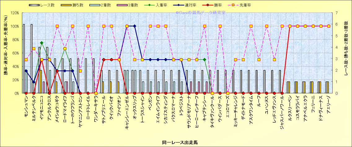 ライバル(相性)解析 同一レースに下記馬が出走した場合の成績とその馬に先着する先着率 |