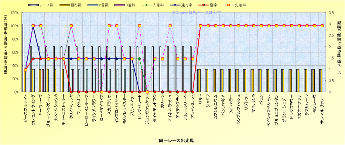 ライバル(相性)解析 同一レースに下記馬が出走した場合の成績とその馬に先着する先着率 |