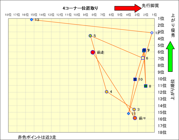 近走における4コーナーでの位置取りと上がり順位(頭数補正後) |